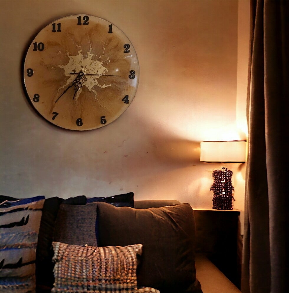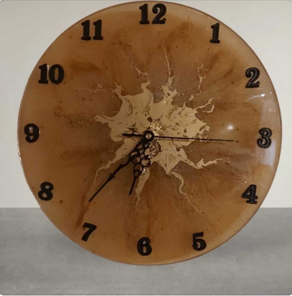 Sublimez votre décoration avec cette horloge murale en résine époxy, où l’élégance du fait main rencontre le charme du sur-mesure. Chaque pièce est entièrement artisanale et unique, conçue avec soin dans notre atelier.