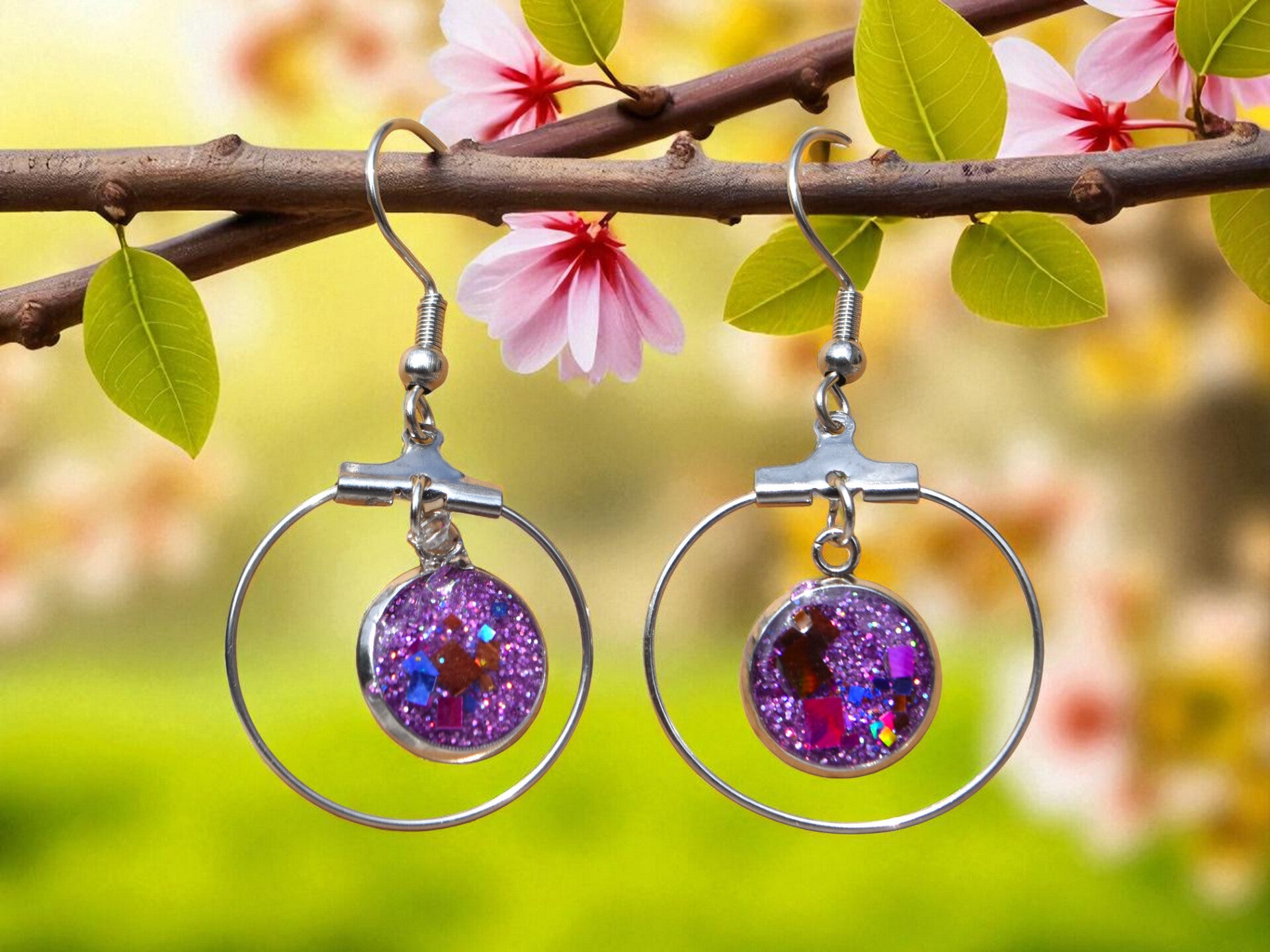 Argentées, cabochon rond avec goutte, paillettes violet et rose - 7,00 €
