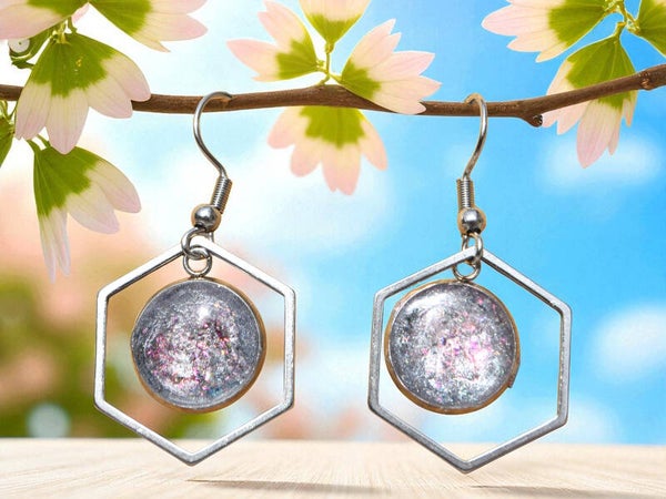Argentées, cabochon simple avec hexagone, argent + rose - 7,00 €