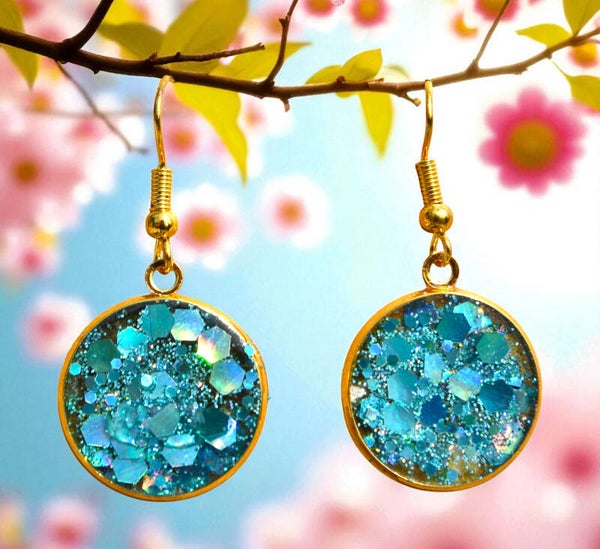 Dorées, cabochon simple rond, bleu avec paillettes - 7,00 €