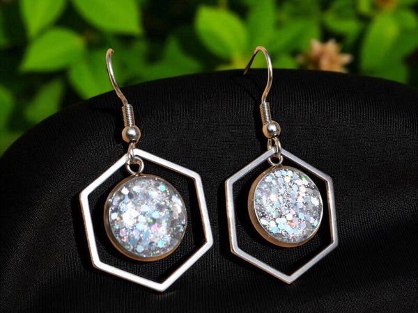 Argentées, cabochon rond avec hexagone, paillettes argentées - 7,00 €