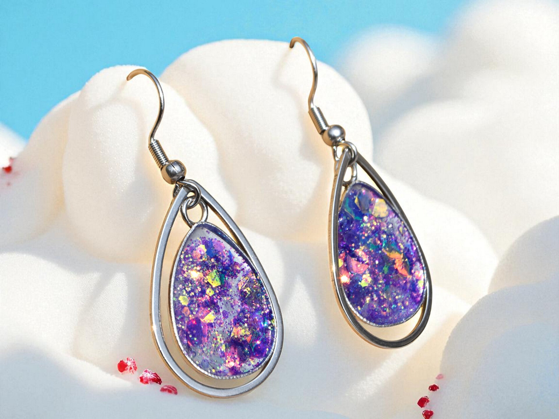 Argentées, petit cabochon avec grand cercle, violet et paillettes bleues et rouges