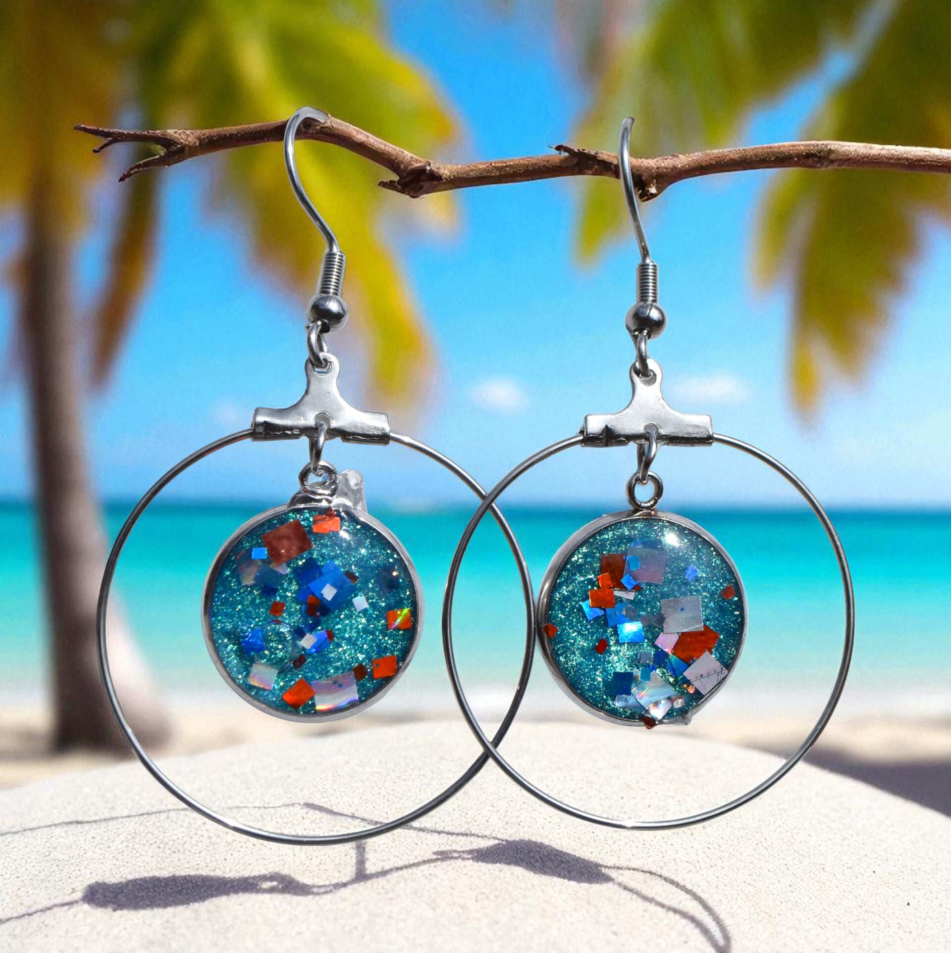 Argentées, petit cabochon avec grand cercle, bleu et paillettes bleues et rouges - 7,00 €