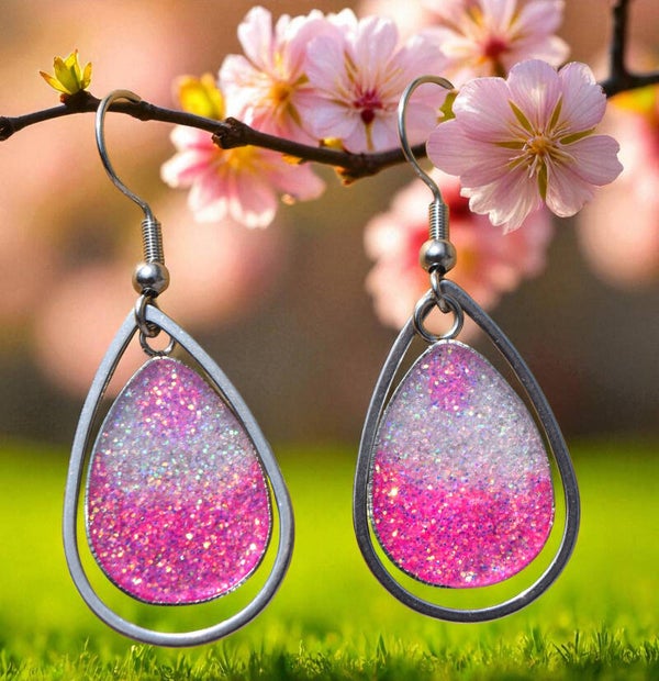 Argentées, cabochon goutte + goutte, paillettes roses phosphorescente - 7,00 €