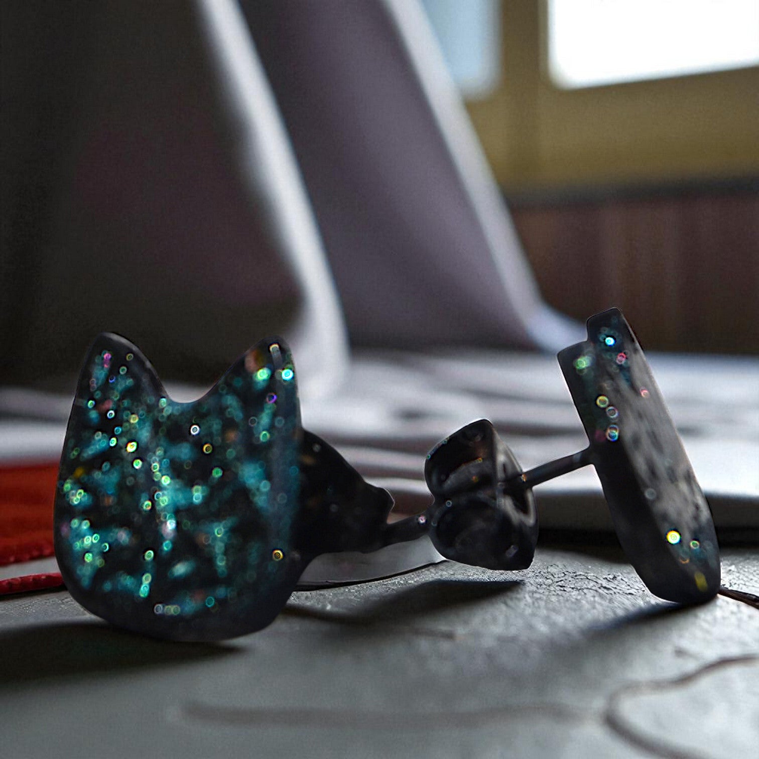 Argentées, cabochon goutte, grosse goute noir holographique et doré