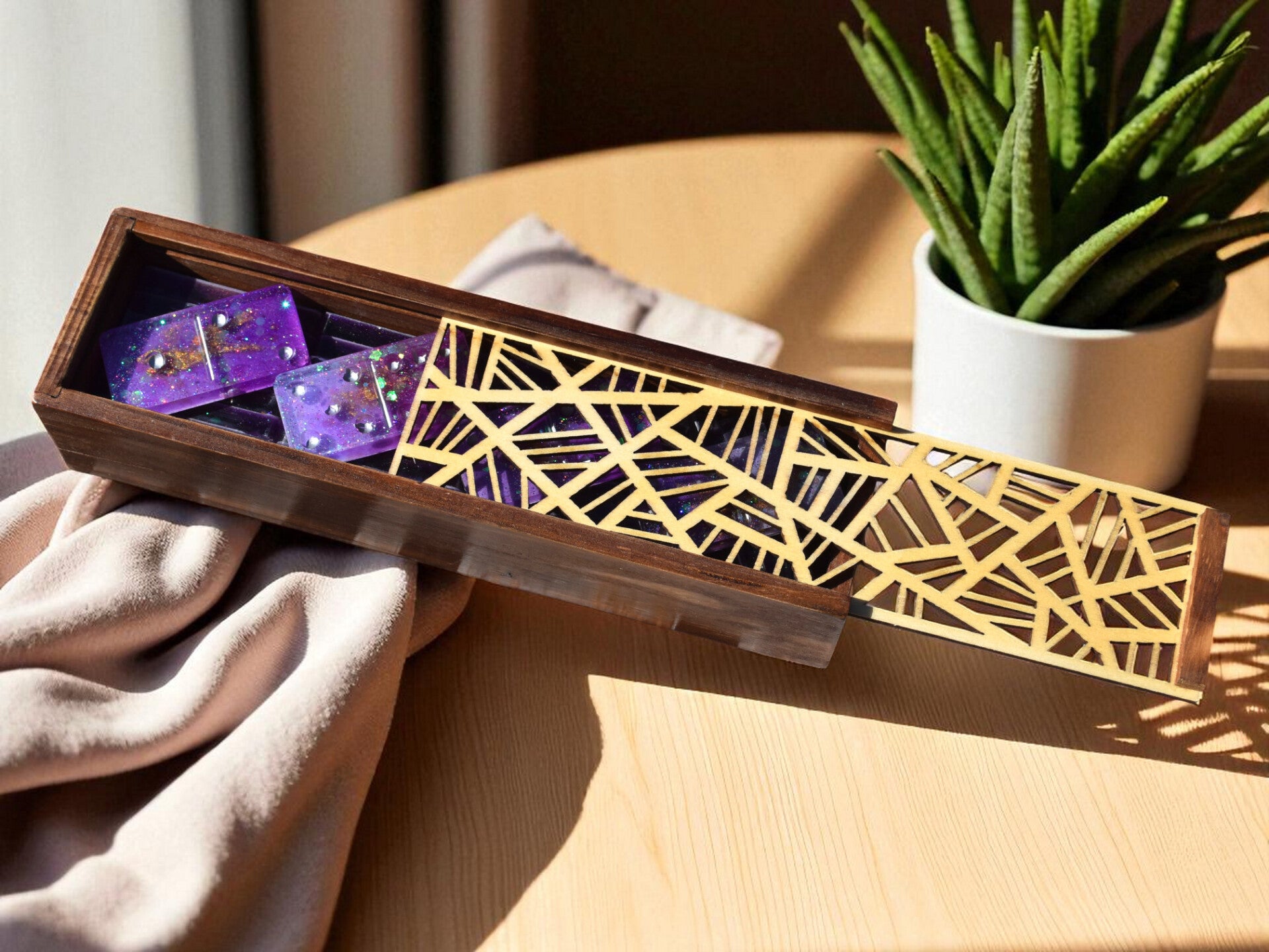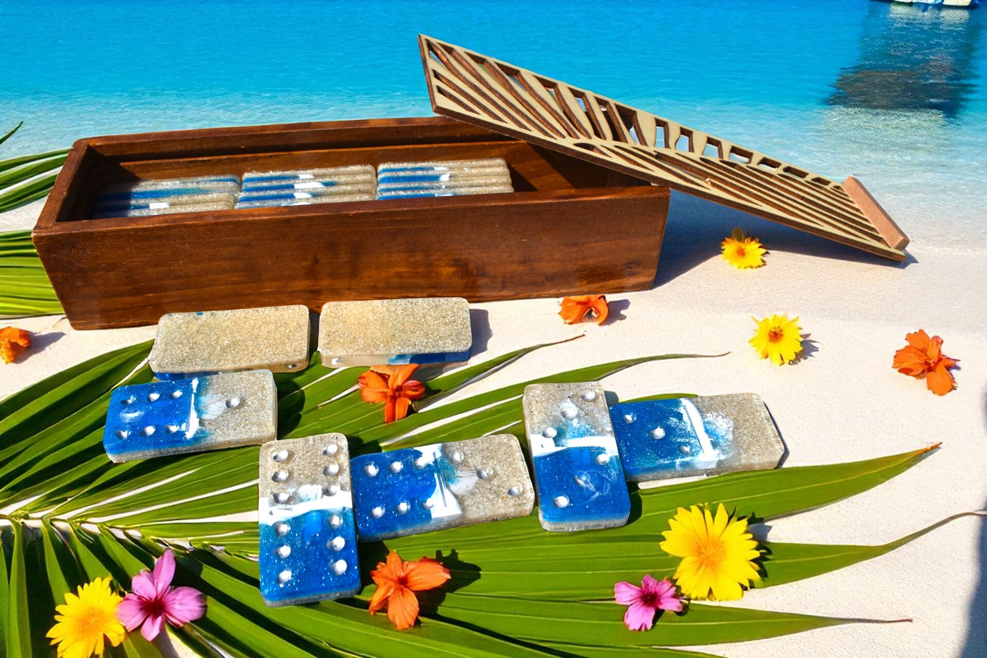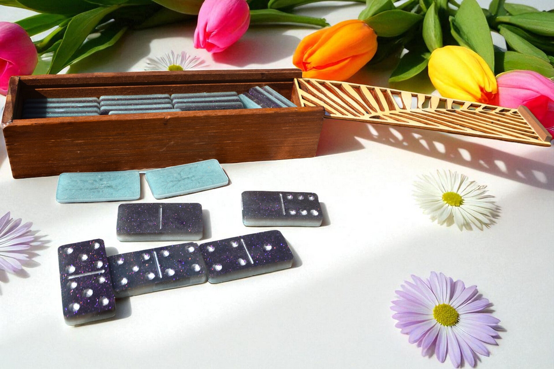 🧩Dominos en Résine Époxy Artisanaux avec Boîte en Bois Gravée