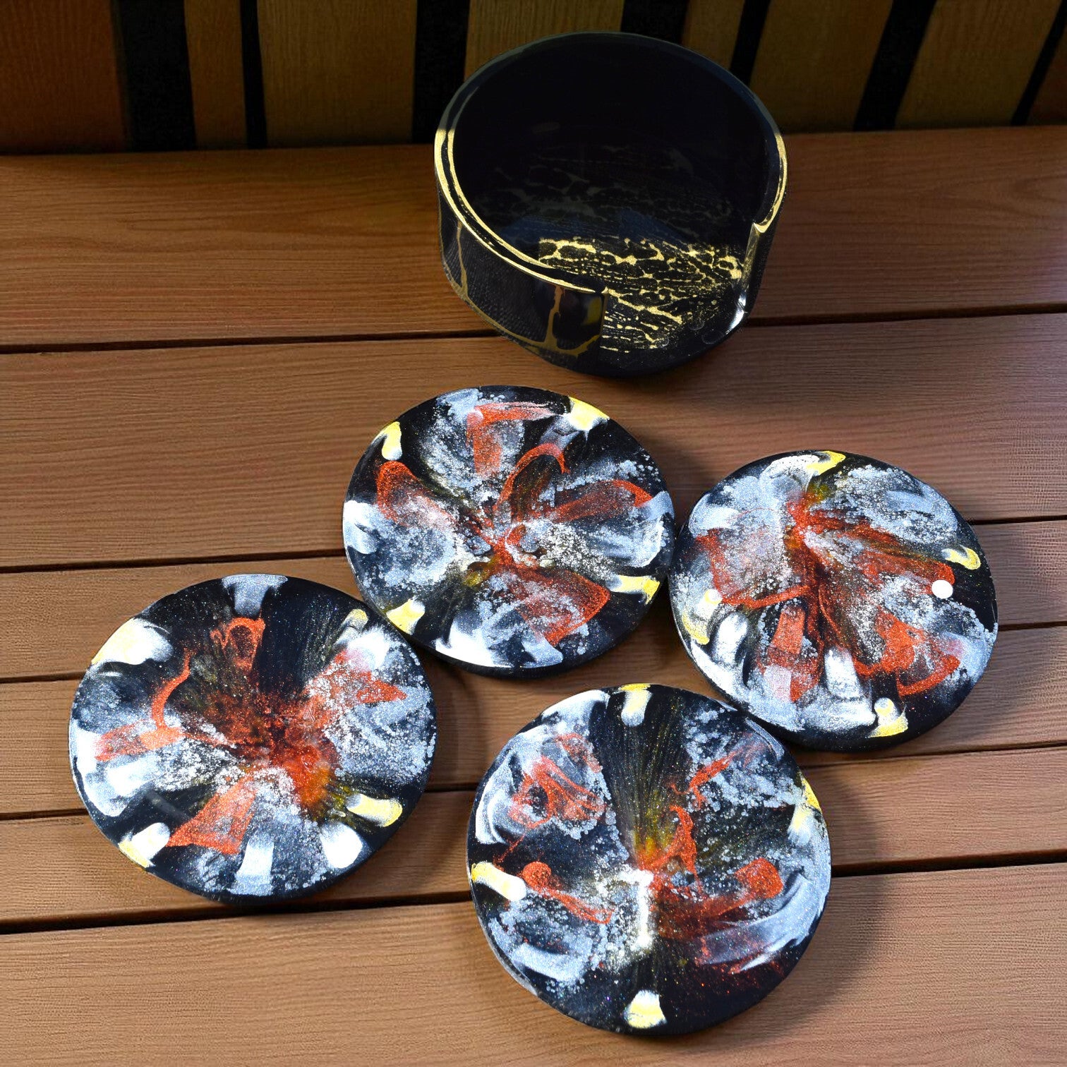 Apportez une touche d'élégance artisanale à votre intérieur avec ce lot de 4 sous-verres ronds en résine époxy, accompagnés de leur support assorti.